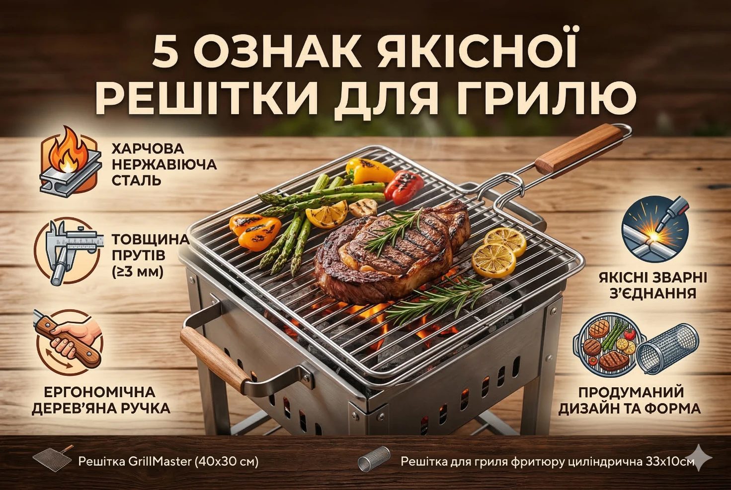 - Теплоємність: товсті прути (від 3 мм і вище) накопичують жар і віддають його м’ясу, створюючи ті самі апетитні «смужки гриль». Тонкі прути просто перерізають волокна, не прогріваючи їх належним чином.