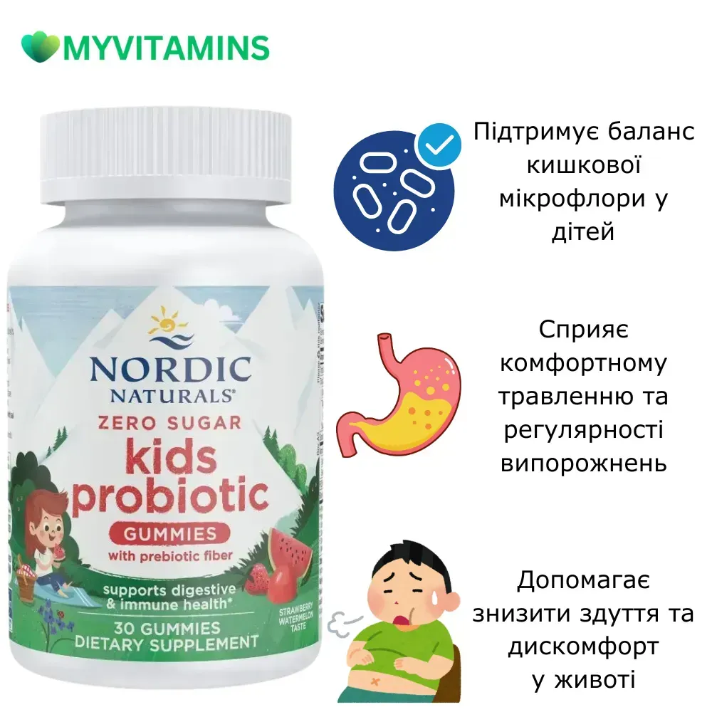 У перші дні, коли ви налагоджуєте їжу та режим, інколи доречно паралельно підтримати мікробіом, якщо раціон бідний на ферментовані продукти або була нещодавня антибіотикотерапія. У такому контексті батьки інколи обирають формати без доданого цукру, наприклад Zero Sugar Kids Probiotic Gummies, Nordic Naturals, як додаток до базових змін.
