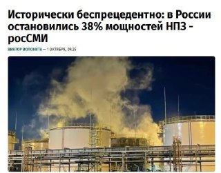 Після нападів українських безпілотників на території росії зупинилося 38% нафтових заводів. Це призвело до зменшення виробництва бензину у вересні на 1 мільйон тонн та дефіциту обсягом 20%.