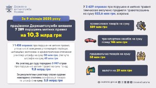 Працівники Держмитслужби зафіксували 7 289 випадків порушень, сума яких сягнула 10,3 млрд грн. Серед тимчасово вилучених предметів правопорушень на 822,6 млн грн виділяються промислові товари (589 млн грн), транспортні засоби (146 млн грн), продовольчі товари (58 млн грн) та валюта (29 млн грн).