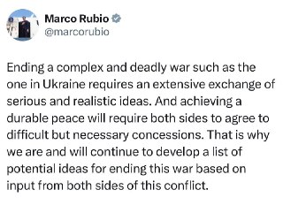 «Завершення складної та смертельної війни, як-от в Україні, вимагає широкого обміну серйозними та реалістичними ідеями. Саме тому ми розробляємо перелік потенційних ідей для завершення війни на основі пропозицій обох сторін цього конфлікту», — зазначив Рубіо.