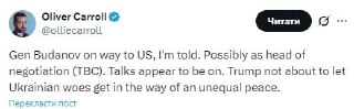 Генерал Буданов вирушає до Сполучених Штатів Америки, щоб, як припускає журналіст видання The Economist, очолити українську переговорну делегацію.