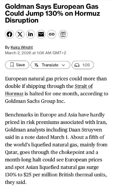 Інвестиційна компанія Goldman Sachs заявляє, що у разі місячного закриття Ормузької протоки ціни на газ у Європі можуть зрости на 130%. Проте наразі цей сценарій розглядається як гіпотетичний.
