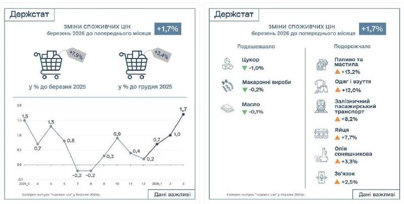 За даними Держстату, інфляція в Україні у березні 2026 року склала 1,7% за місяць та 7,9% у річному вимірі. Базова інфляція досягла 7,1%.