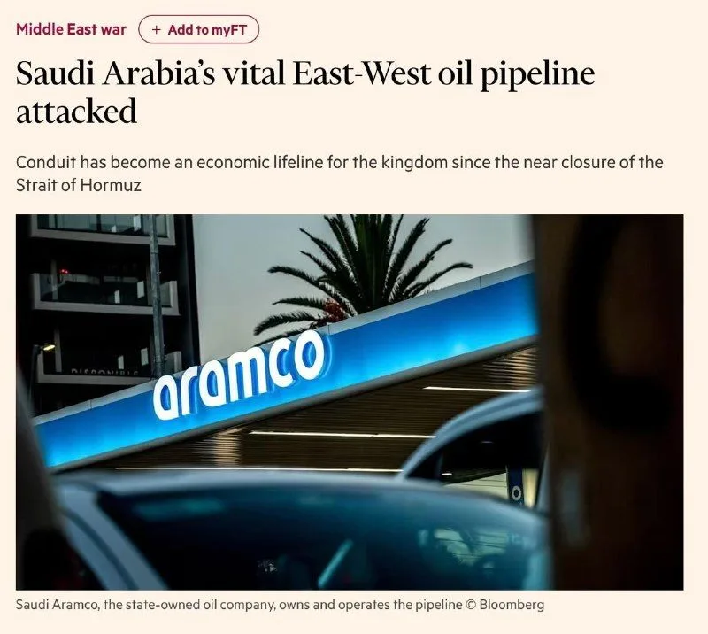 Іран здійснив атаку дроном на трубопровід “Схід-Захід” у Саудівській Аравії. Цей трубопровід транспортує нафту з узбережжя Перської затоки до Червоного моря, дозволяючи обійти заблокований Ормуз. Про це повідомляє Financial Times.
