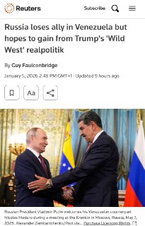 Кремль сподівається переконати США обміняти Венесуелу на Україну, тобто не буде заважати американцям в Венесуелі в обмін на поступки стосовно російських планів щодо України, – Reuters. У Москві вважають, що усунення режиму Мадуро означає для США оголошення Латинської Америки своєю зоною впливу. Кремль бачить можливість домовленостей типу «сфера на сферу», що цікаво, ця пропозиція від росії лунала ще в першу каденцію Трампа.