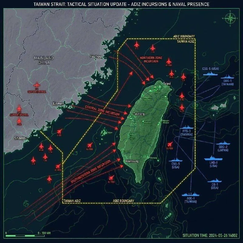 В цей момент зафіксовано масштабну присутність китайської військової авіації поблизу кордонів Тайваню. Влада острова видала тривожне повідомлення, вказуючи на значну кількість літаків ВПС Китаю біля країни.