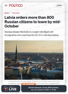 Влада країни прийняла рішення зобов’язати 841 громадянина росії, що не змогли підтвердити знання держмови, залишити територію Латвії до 13 жовтня. Якщо росіяни не виконають вимогу, буде розпочато процедуру їхньої депортації. Рішення спрямоване на забезпечення виконання законів держави щодо знання мови.