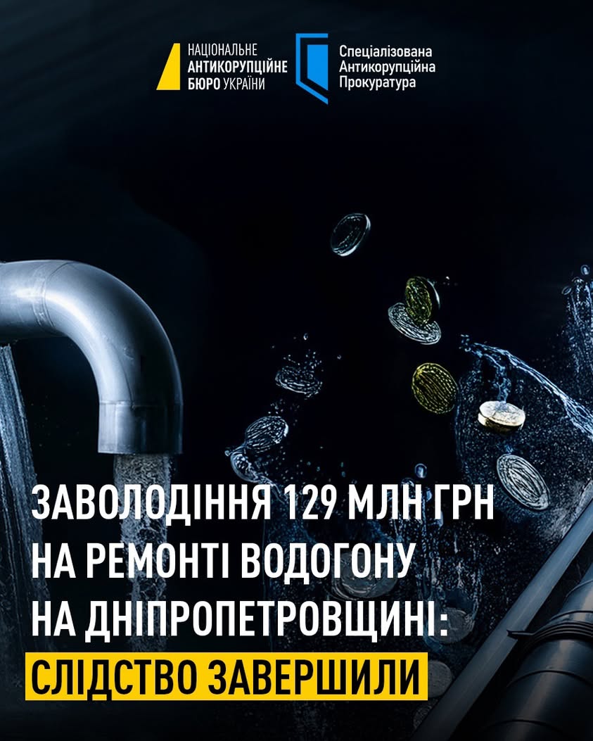 Національне антикорупційне бюро України (НАБУ) та Спеціалізована антикорупційна прокуратура (САП) оприлюднили факти щодо корупційної змови з розкраданням 129 мільйонів гривень, призначених для відновлення інфраструктури Дніпропетровської області.
