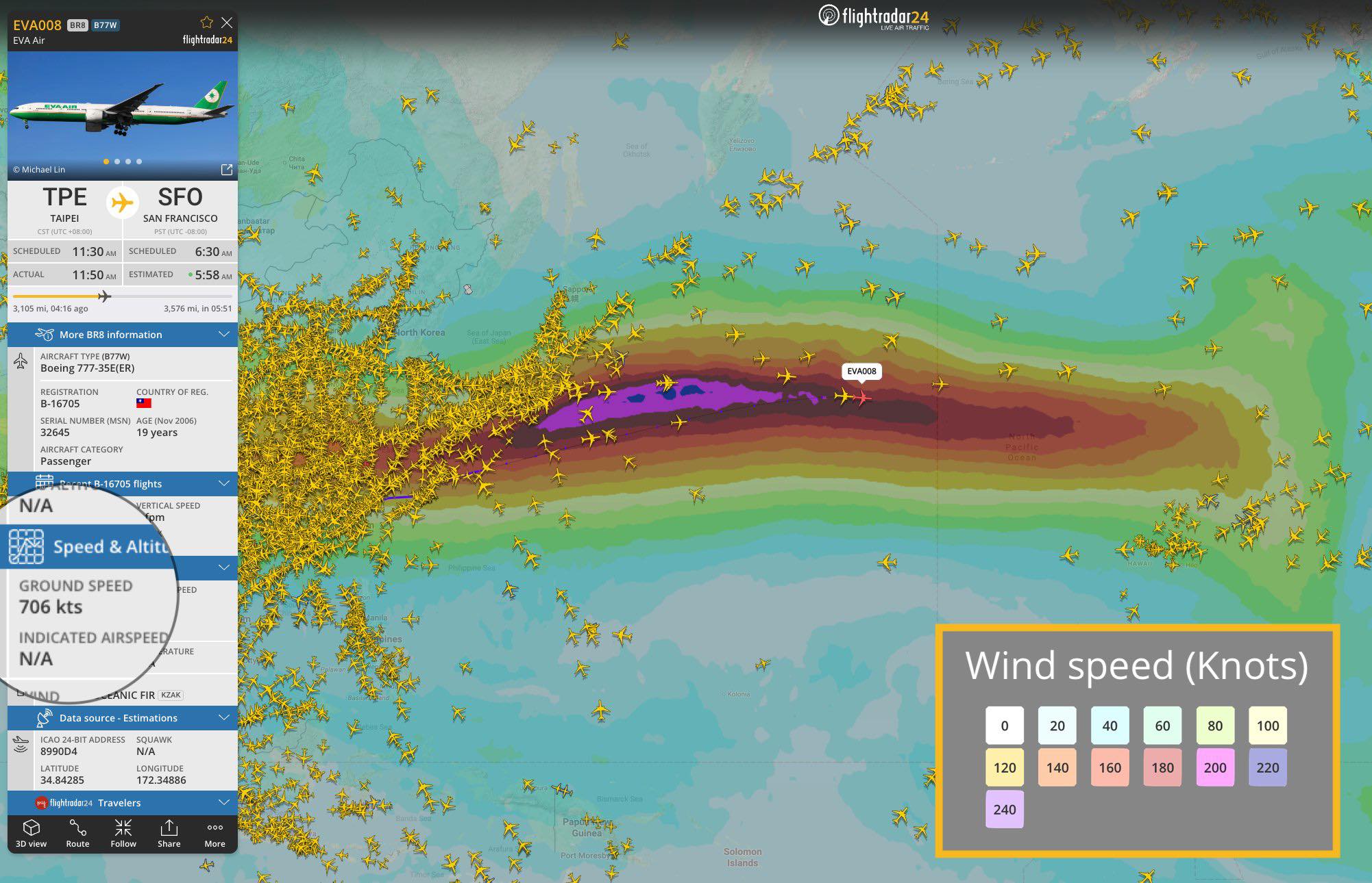 Однак пояснення криється не в перевищенні технічних можливостей літака, а в сприятливих атмосферних умовах. Зокрема, йдеться про так званий North Pacific jet stream — це вузький потік потужного західного вітру, який формується у верхніх шарах тропосфери на висоті приблизно 9–12 км. Швидкість цього потоку може досягати 200–400 км/год і навіть перевищувати ці межі.