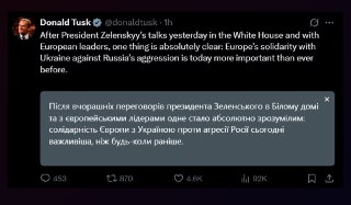 За словами Туска, після переговорів президента Зеленського у Білому домі та з європейськими лідерами, стало очевидно: солідарність Європи з Україною проти агресії росії нині важливіша, ніж будь-коли. «Після переговорів президента Зеленського в Білому домі та з європейськими лідерами одне стало абсолютно зрозумілим: солідарність Європи з Україною проти агресії росії сьогодні важливіша, ніж будь-коли», – заявив Туск.