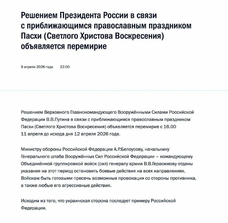 За повідомленнями російських ЗМІ, Путін оголосив про Великоднє перемир’я. Воно триватиме з 16:00 11 квітня до кінця дня 12 квітня, тобто трохи більше доби.
