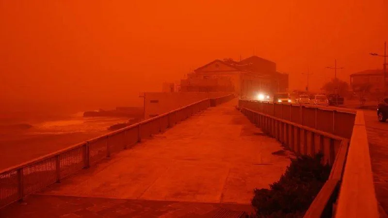 Небо над Критом та кількома островами Егейського моря набуло червоного відтінку через пил, принесений вітрами з Сахари. Сильні південні вітри доставили пісок з Північної Африки на Крит, Санторіні, Наксос та Міконос, що значно погіршило видимість: автомобілі навіть вдень їздять з увімкненими фарами.