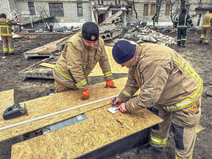 Внаслідок удару безпілотників у 9-поверхівку в Охтирці, рятувальники, комунальники, волонтери та місцеві жителі працювали разом задля допомоги постраждалим.