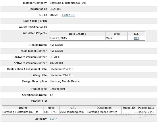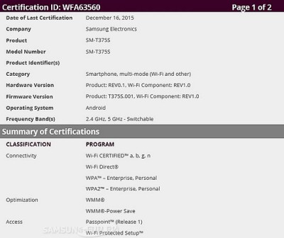Як було відмічено в мережі, південнокорейський гігант має намір випустити чергову новинку для користувачів – 8-дюймовий планшет. Цей пристрій з номером моделі SM-T375S отримав сертифікат для Bluetooth від компанії Special Interest Group і пройшов сертифікацію Wi-Fi від WiFi Alliance. Стало відомо, що сертифікати для планшета були видані не так давно: 24 грудня на Bluetooth і 16 грудня на Wi-Fi.