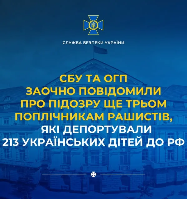 Служба безпеки України спільно з Офісом Генерального прокурора заочно повідомили про підозру трьом посадовцям окупаційної адміністрації рф на Донеччині, які брали участь у масовій депортації 213 українських дітей до росії, про це повідомили у Службі безпеки України.