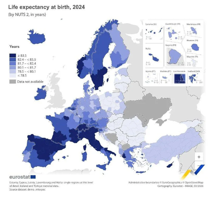 Серед регіонів ЄС з найнижчою очікуваною тривалістю життя є Болгарія — 73,9 року, Франція — 74,5 року та Угорщина — 75,1 року. У 2024 році очікувана тривалість життя для жінок у ЄС становила 84,1 року, а для чоловіків — 78,9 року.