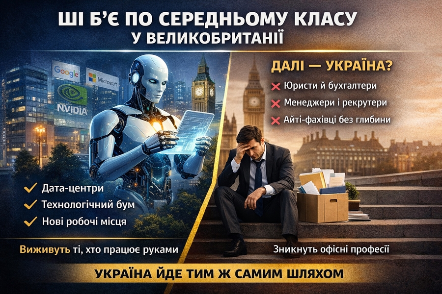 Британія демонструє жорстку правду: штучний інтелект підриває не нижчі, а середні шари суспільства. В Україні насамперед постраждають офісні працівники, а за ними — цілі урбаністичні класи.