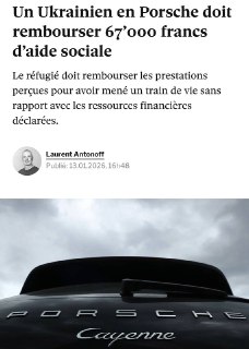 Український біженець користувався соціальною допомогою, маючи при цьому автомобіль Porsche Cayenne та подорожуючи різними країнами. За даними видання 24 heures, чоловік продовжував отримувати матеріальну підтримку від держави, попри наявність у його власності такого розкішного майна. Це стало причиною для перегляду наданої йому допомоги та примусу до повернення коштів.