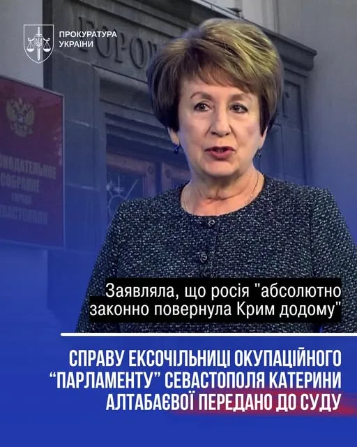 Прокурори Офісу Генерального прокурора скерували до суду обвинувальний акт щодо колишньої голови так званих «законодавчих зборів Севастополя» та члена Ради Федерації рф від окупаційної влади Катерини Алтабаєвої. За даними слідства, вона є однією з публічних представниць окупаційної адміністрації, яка після 2014 року обіймала керівні посади як у Севастополі, так і на федеральному рівні в рф.