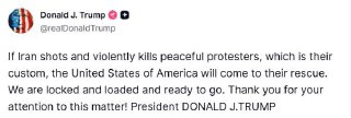 Президент Дональд Трамп заявив, що Сполучені Штати готові прийти на допомогу мирним демонстрантам, якщо Іран застосує силу. Він зазначив, що США знаходяться у повній бойовій готовності. «Якщо Іран відкриє вогонь і жорстоко вбиватиме мирних протестувальників, що є їхньою звичною практикою, США прийдуть їм на допомогу. Ми повністю готові та приведені в бойову готовність», — заявив президент Трамп.