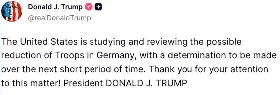 «Американська сторона в даний час вивчає можливість зменшення військової присутності в Німеччині. Рішення буде прийнято найближчим часом», — заявив Трамп у Truth Social.
