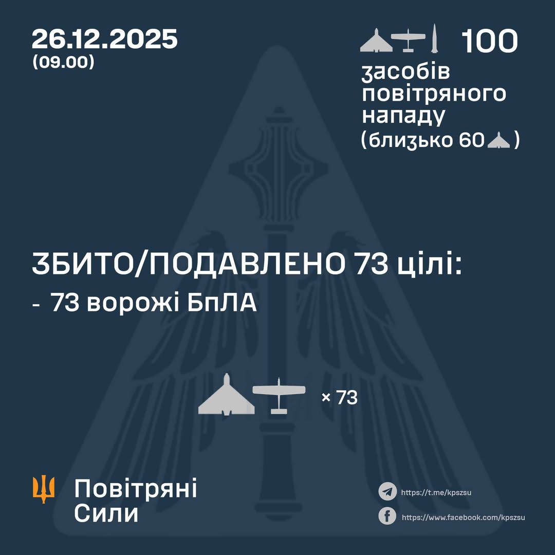 На ніч з 25 на 26 грудня українські військові відбили масштабну атаку дронів і ракети. Противник задіяв одну балістичну ракету “Іскандер-М” з території тимчасово окупованого Криму та 99 ударних безпілотників “Shahed”, “Гербера” й інших типів з напрямків росії та Криму.