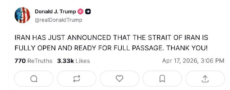 Іран тільки що оголосив, що протока Ірану повністю відкрита і готова до вільного проходу. Дякую!