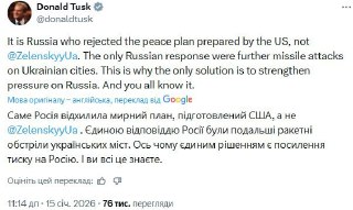 Туск підкреслив, що саме росія відкинула мирний план, розроблений Сполученими Штатами. Це сталося, попри заяви, які звинувачували Володимира Зеленського у відмові від погодження. «Це саме росія відхилила мирний план, і хочеться спростувати звинувачення на адресу українського президента», — заявив Дональд Туск.