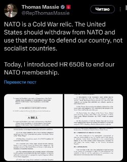 Республіканський конгресмен Томас Массі виступив з ініціативою вийти зі складу НАТО, подаючи відповідний документ. Він зазначив, що «НАТО — це пережиток холодної війни». Массі аргументує свій крок тим, що США повинні зосередити фінансові ресурси на власній обороні. Він заявив: «Сьогодні я вніс HR 6508, щоб припинити членство США в НАТО». Законопроєкт передбачає вихід країни з Альянсу та **перенаправлення мільярдів доларів** на захист власної країни.