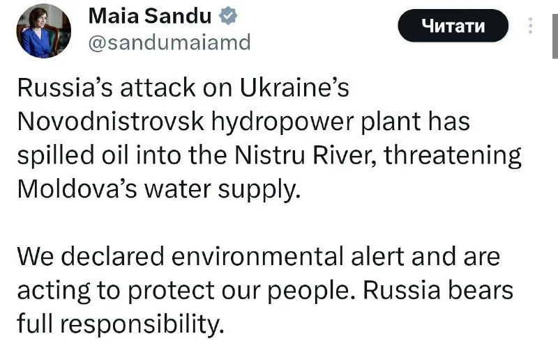 Президент Молдови Майя Санду оголосила про екологічну тривогу, оскільки річка Дністер є важливим джерелом питної води для цієї країни та сусідньої України. За словами омбудсмена Дмитра Лубінця, наслідки цього обстрілу можуть зачепити життя мільйонів людей.