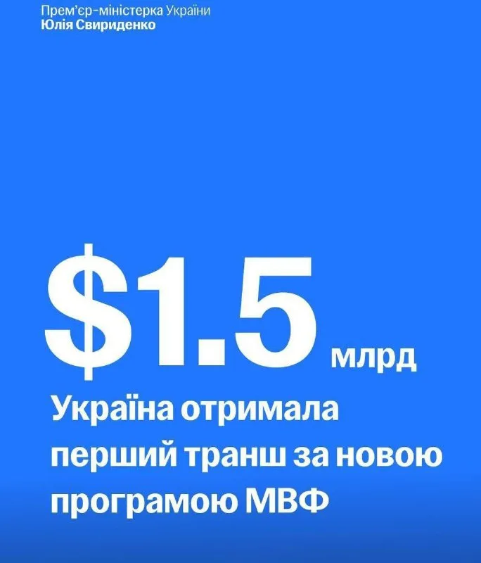 ‼️ Україна отримала перший транш у $1,5 млрд від МВФ за новою чотирирічною програмою, — Свириденко.