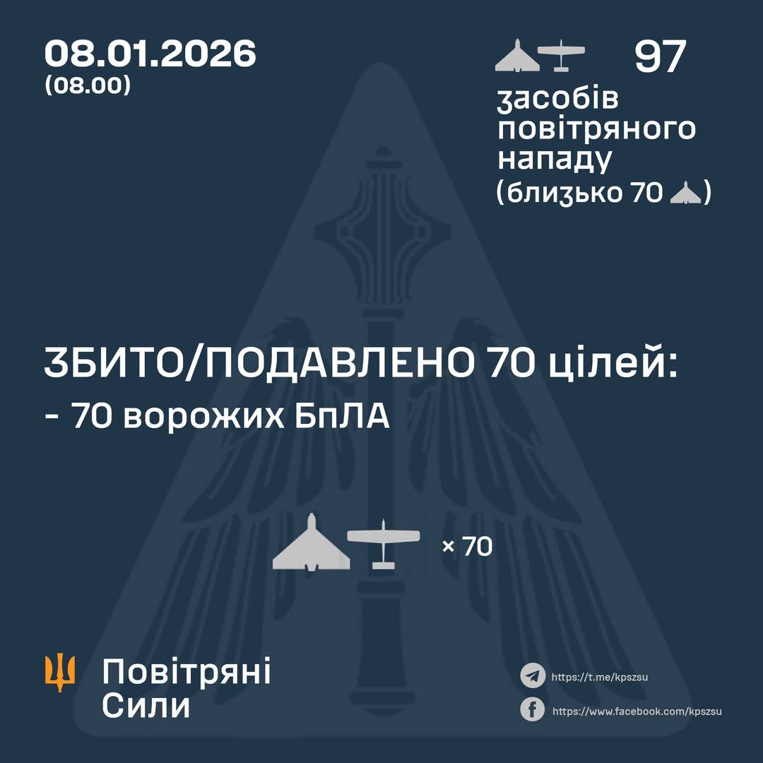 У ніч на 8 січня українські Сили оборони збили або подавили 70 ворожих БПЛА.