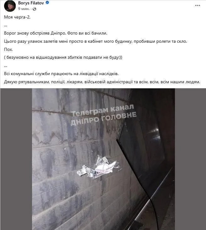 Під час атаки на Дніпро уламок російського БпЛА влучив у кабінет будинку мера Бориса Філатова. Уламок пробив скло та захисні ролети.