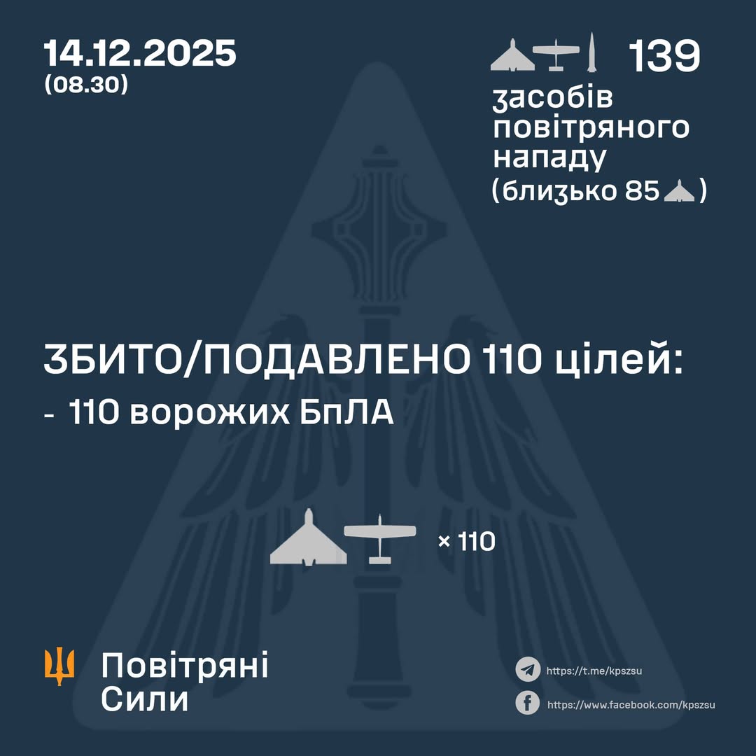 Збройні сили України знищили або подавили 110 ворожих безпілотників у ніч на 14 грудня.