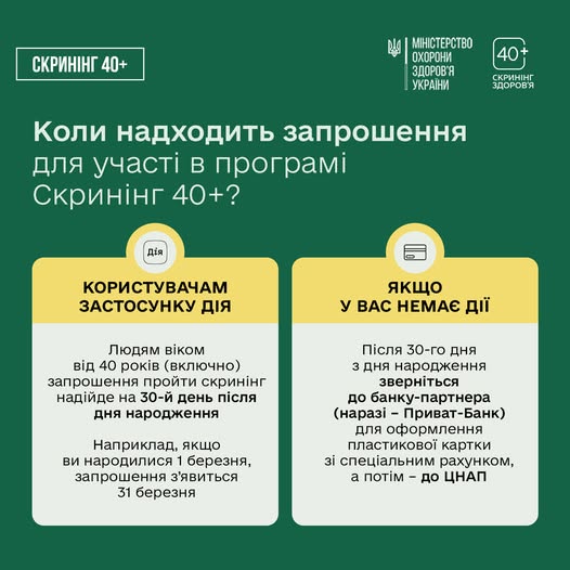 Старше населення отримає **запрошення** на скринінг через застосунок Дія, починаючи з 30-го дня після дня народження. Після підтвердження участі, на Дія.Картку буде зараховано **2000 гривень**, які можна використати винятково для проходження скринінгу.