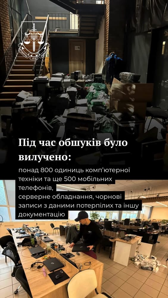 Серед потерпілих – громадяни України, країни ЄС та Азії. Під час обшуків вилучено понад 800 одиниць комп’ютерної техніки, майже 500 мобільних телефонів, серверне обладнання, чорнові записи з персональними даними потерпілих та «скрипти» розмов.