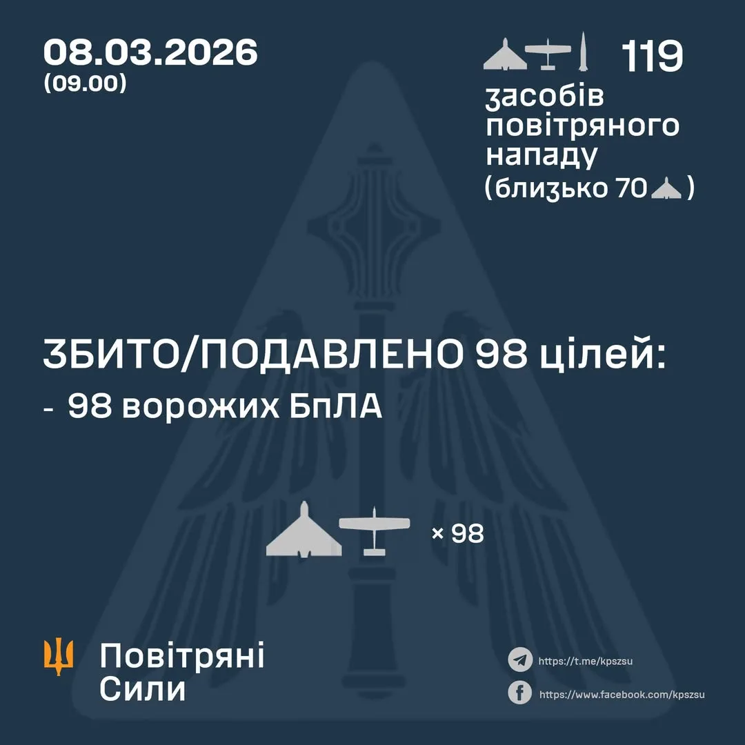 Авіація, зенітні ракетні війська, підрозділи РЕБ та безпілотних систем, а також мобільні вогневі групи Сил оборони України успішно відбили повітряний напад. За попередніми даними, станом на 09:00, збито/подавлено 98 ворожих БпЛА типу Shahed, Гербера і дрони інших типів на півночі, півдні та сході країни. Зафіксовано влучання двох балістичних ракет та 19 ударних БпЛА на 11 локаціях.