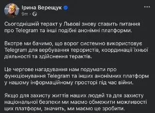 Заступниця голови Офісу Президента Ірина Верещук виступила з ініціативою обмежити користування Telegram після теракту у Львові. Про це повідомляє Tsaplienko.