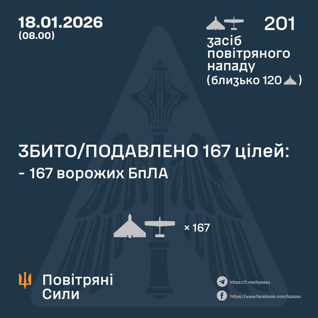 Станом на 08:00 станом на ранок 18 січня, успішно відбито атаку завдяки захисту понад 167 ворожих дронів.
