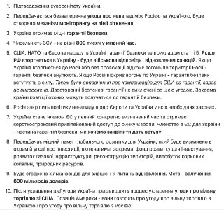 Серед ключових моментів мирного плану є «підтвердження суверенітету України» та укладення угоди про ненапад з росією. Крім того, план передбачає безпекові гарантії, зокрема надання їх США, НАТО та Європою, за прикладом статті 5 про спільну оборону. Тобто у випадку нападу рф буде військова відповідь та відновлення санкцій. Передбачено також чисельність ЗСУ у 800 тисяч під час миру.