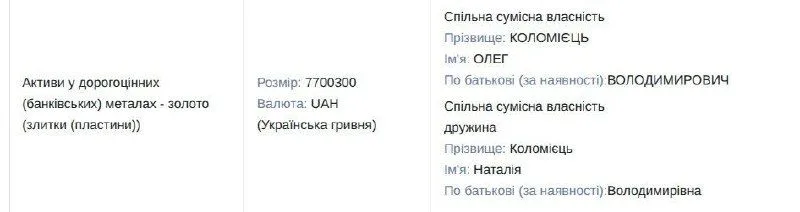 Олег Коломієць задекларував 1,74 кг золота у злитках, а також 35 000 доларів та 8 500 євро готівкою. Окрім цього, у його декларації зазначено ювелірні вироби із золота і срібла на суму 778 826 гривень.