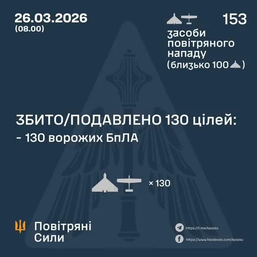 У ніч на 26 березня українські сили оборони відбили масовану атаку ворожих безпілотників. Противник запустив 153 ударні БПЛА типу Shahed, Гербера, Італмас та інших з напрямків Брянськ, Курськ, Орел, Міллерово, Приморсько-Ахтарськ у Росії, а також з окупованого Криму.