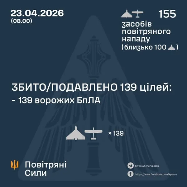 У ніч на 23 квітня українські сили оборони успішно відбили атаку ворожих безпілотників. Противник запустив 155 ударних БПЛА різних типів, включаючи Shahed, Гербера та Італмас, з напрямків Курськ, Орел, Міллерово, Шаталово та Приморсько-Ахтарськ.