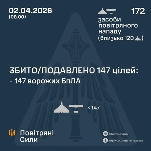 У ніч на 2 квітня українські сили оборони відбили масштабну атаку ворожих безпілотників. Противник запустив 172 ударні БпЛА типу Shahed, Гербера, Італмас та інших з напрямків Брянськ, Курськ, Орел, Міллерово, Приморсько-Ахтарськ, а також з окупованих територій Донецька та Криму.