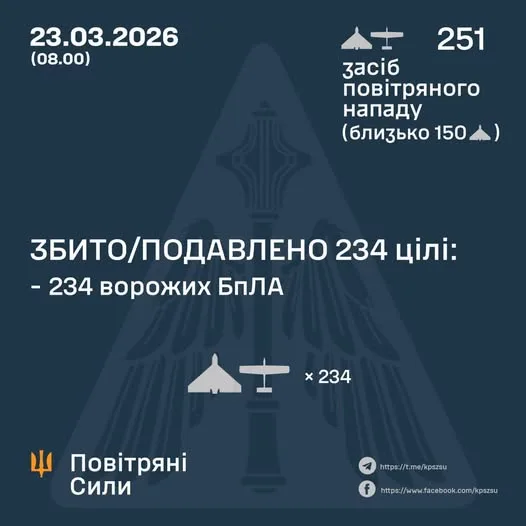 У ніч на 23 березня українські сили оборони відбили масовану атаку ворожих безпілотників. Противник запустив 251 ударний БпЛА типу Shahed, Гербера, Італмас та інших з напрямків Брянськ, Орел, Курськ, Міллєрово, Приморсько-Ахтарськ у Росії та Гвардійське в тимчасово окупованому Криму. Близько 150 з них були “шахедами”. Про це повідомили у Генеральному штабі ЗСУ.