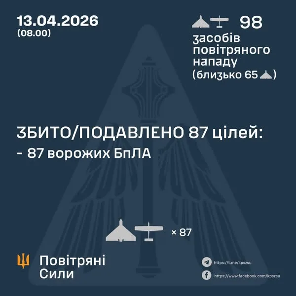 Протягом ночі з 12 на 13 квітня, Повітряні Сили ЗСУ збили або подавили 87 ворожих безпілотних літальних апаратів з 98 випущених. Атака здійснювалася ударними БпЛА типу Shahed, Гербера, Італмас та іншими дронами з напрямків Орел, Брянськ, Курськ, Міллєрово, Приморсько-Ахтарськ в Росії та Гвардійське в тимчасово окупованому Криму. Близько 65 з них – це “шахеди”.